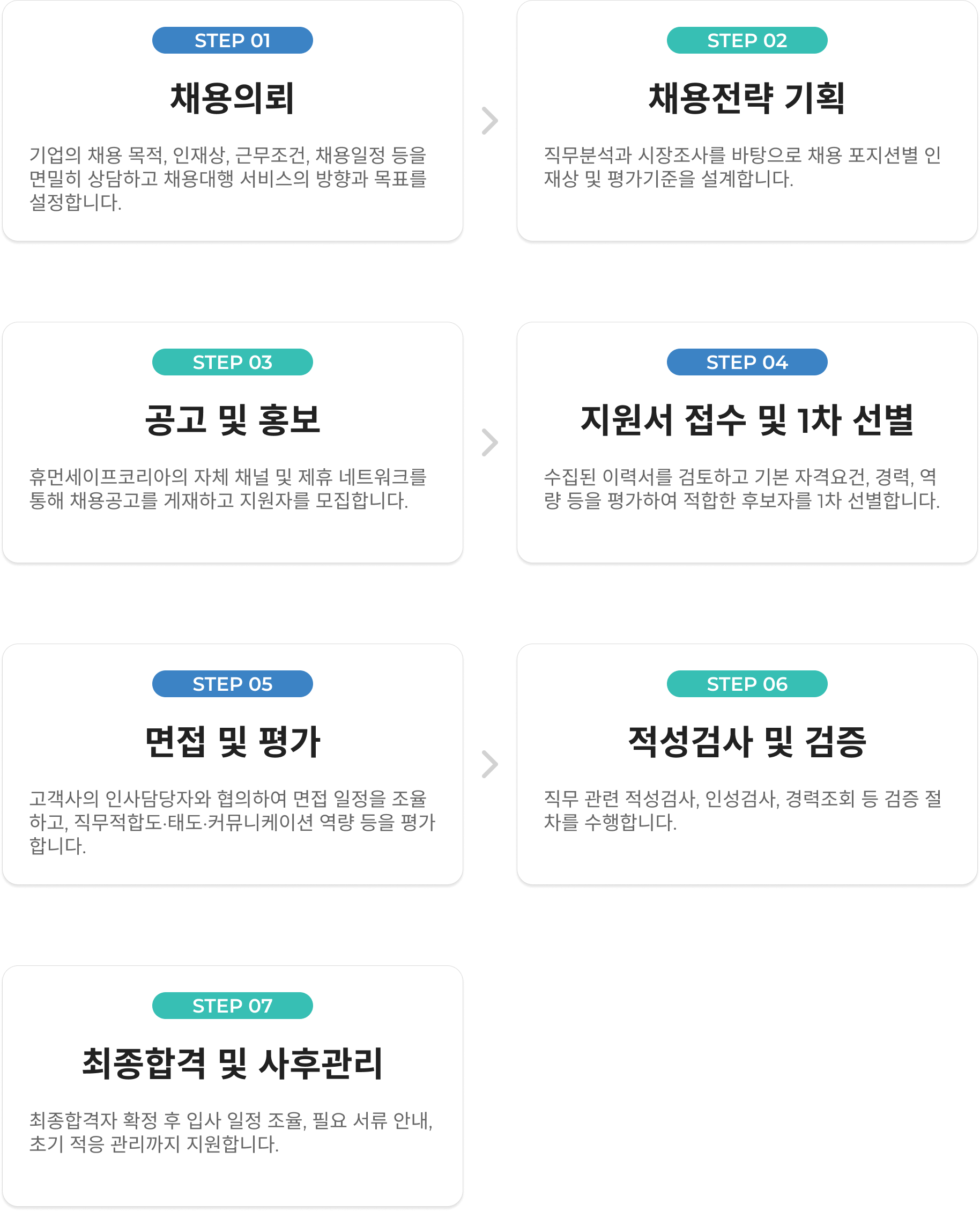 단순한 인력 알선이 아닌, 기업의 조직문화·직무요건·경영방향에 부합하는 인재를 선별하여, 채용의 품질과 효율을 동시에 높이는 맞춤형 채용 솔루션입니다.